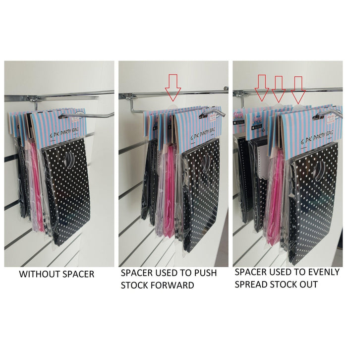 A simple and cheap solution to neatly display stock on hooks and prongs. These stock limiters allow you to space out, hold back or bring forward stock on hooks for clean and professional look to your store or display.