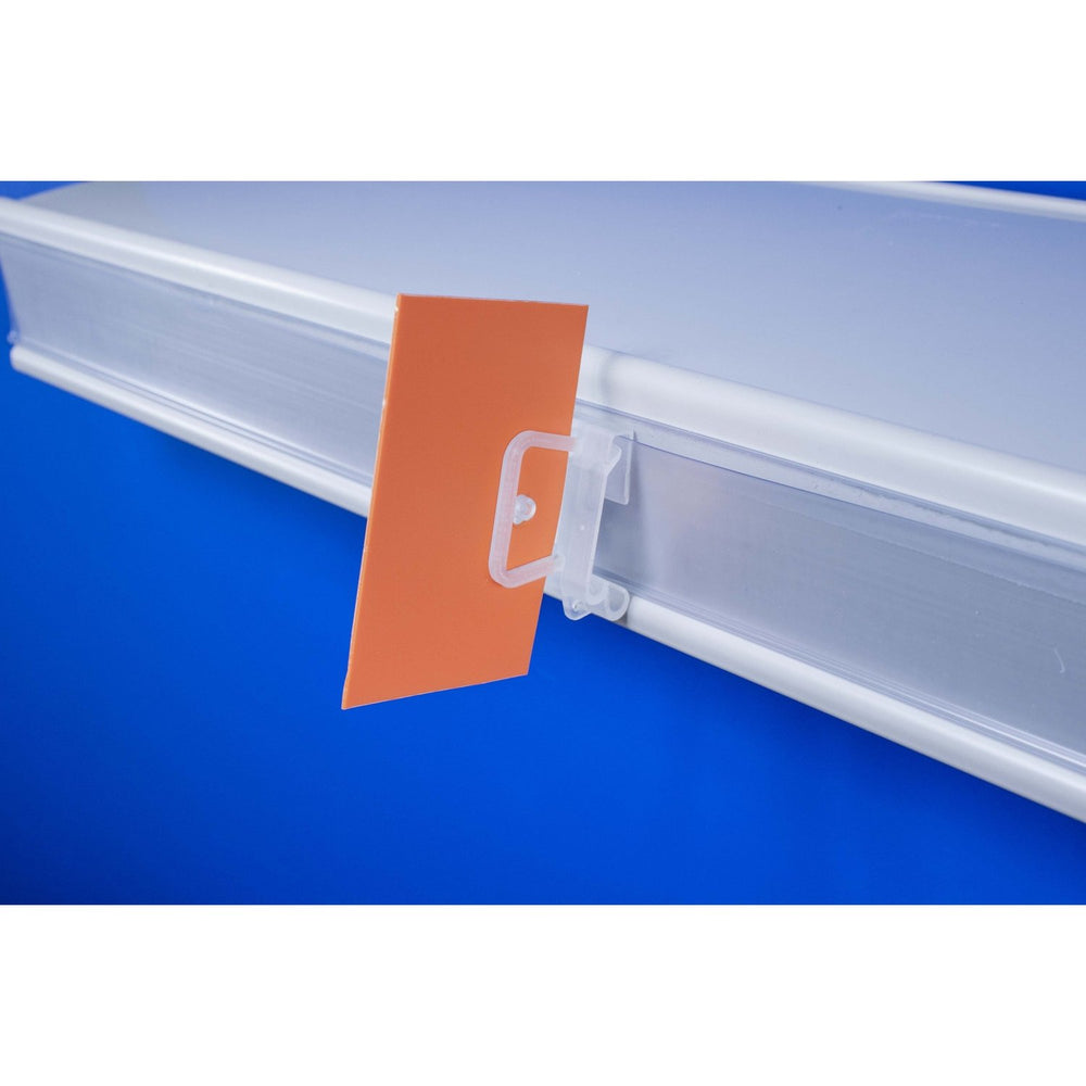 Used on shelves with data strips to display promotional media at a 90 degree angle.